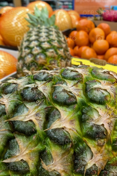 Детальный снимок спелого ананаса на фоне других фруктов в супермаркете