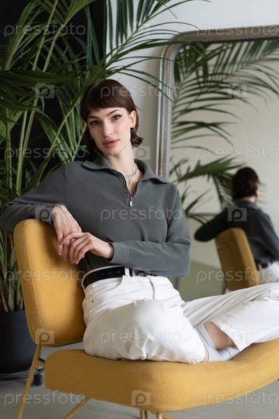 Молодая красивая женщина сидит в кресле в студии в свитере