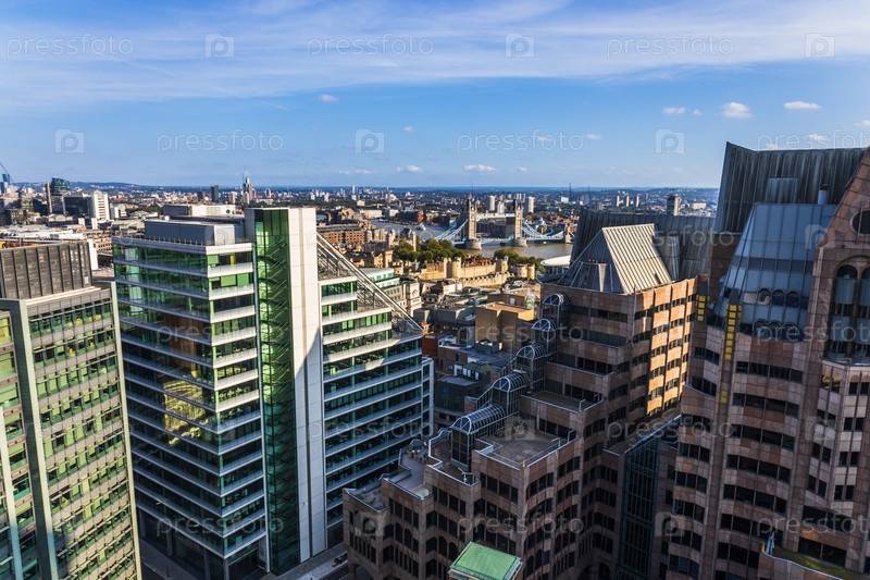Вид с воздуха на высотные здания и городской пейзаж Лондона, демонстрирующий современную архитектуру под ясным голубым небом