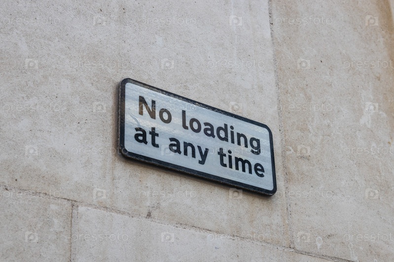 Знак на каменной стене, запрещающий погрузку в любое время, указывающий на ограничение парковки и разгрузки
