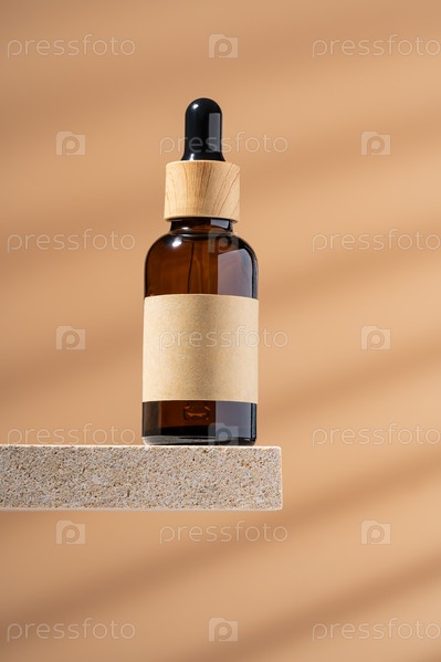 Макет янтарного стеклянного флакона с пустой этикеткой и бамбуковой крышкой-капельницей на постаменте из натурального камня. Сыворотка для лица, эфирное масло для ухода за женской кожей на коричневом фоне, макет