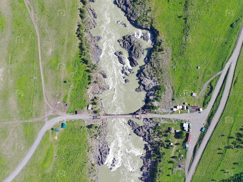 Вид с вертолета на Ороктойский мост, автомобильный висячий мост, реку Катун. Республика Алтай. Горный Алтай. Чемал. Россия. 2024