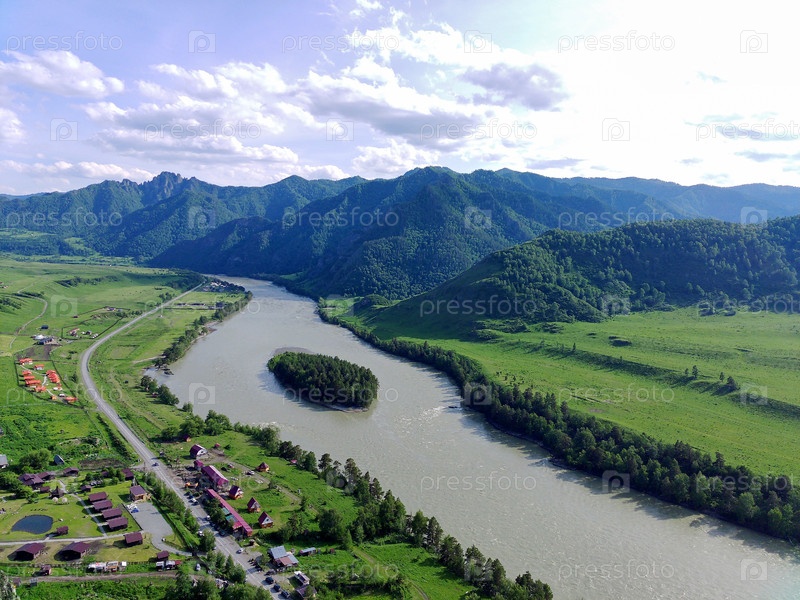 Река Катун и горы с смотровой площадки ущелья Че-Чкыш. Съемка на квадрокоптере. Республика Алтай, Чемальский район. 2024 Россия, Республика Алтай, Чемальский район. Вид на реку Катун и горы с обзорной палубы ущелья Че-Чкиш