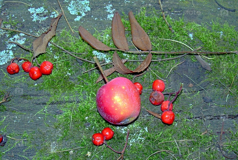 Осень пришла. ягоды рябины, листья рябины, на старой замшелой доске