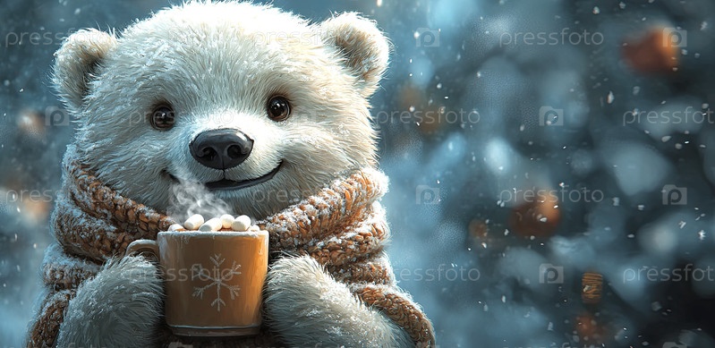 Милый, дружелюбный белый медведь в уютном большом шарфе держит дымящуюся чашку горячего какао с крошечными зефирками