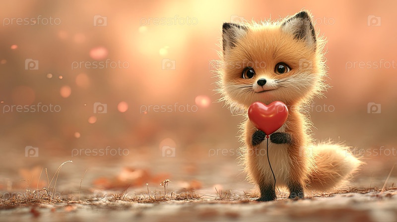 Милый лисенок с сердцем в лапах в лучах солнца, персиковый фон с местом для копирования