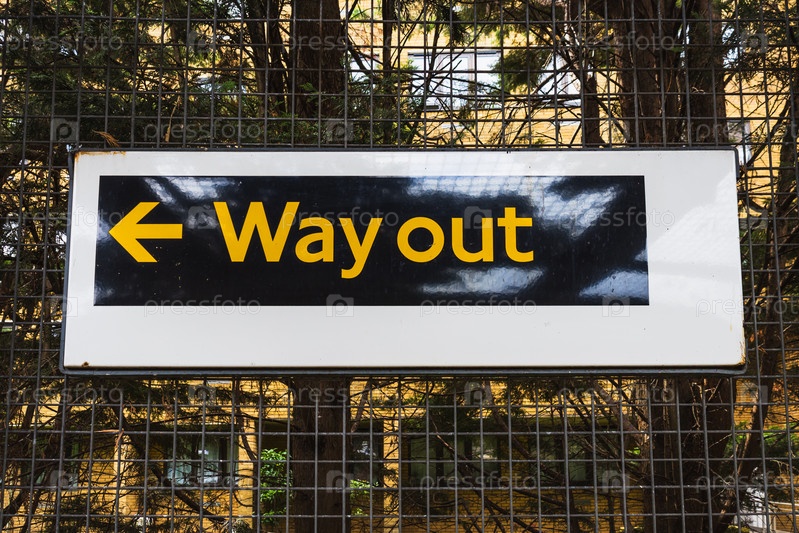 Знак «Выход» с жирными желтыми буквами и стрелкой, сфотографированный на открытом воздухе в городской среде
