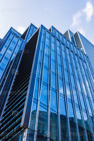 Современный стеклянный небоскреб с отражающими окнами, фиксирующими небо и облака в городской среде