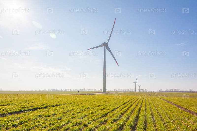Ветряная турбина на зеленом поле с солнечными бликами на фоне голубого неба