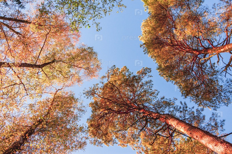 Кроны деревьев осенью с желтыми листьями, вид снизу