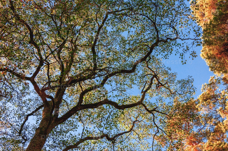 Кроны деревьев осенью с желтыми листьями, вид снизу