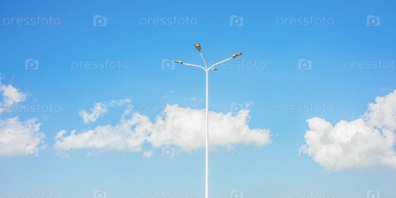 Высокие фонарные столбы на фоне голубого неба и белых облаков