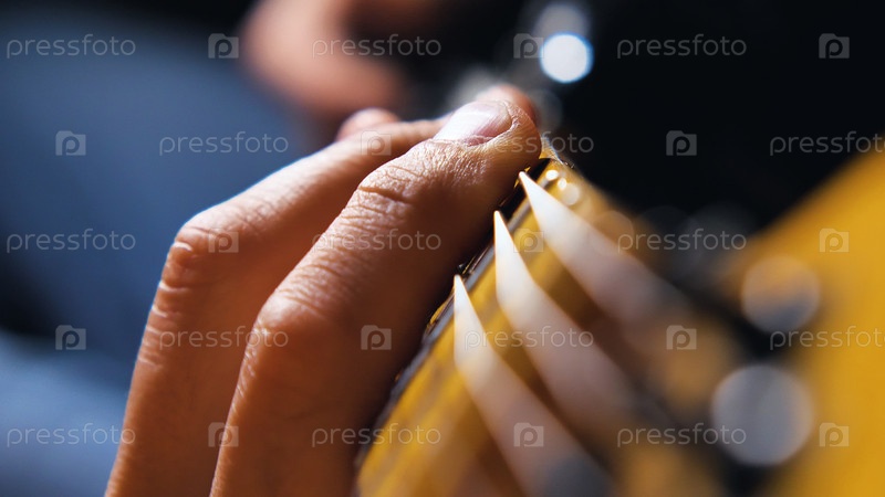 Крупный план руки, играющей на электрогитаре, фокус на пальцах, нажимающих на струны. Фон размыт, подчеркивая детали руки и струн гитары