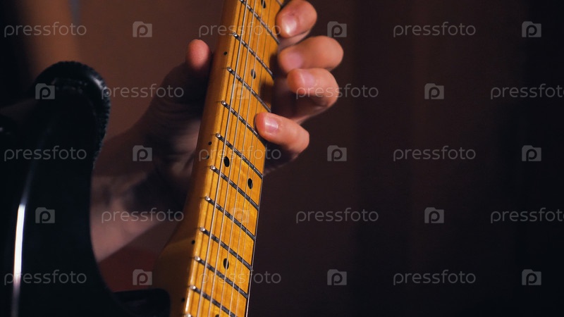 Крупный план грифа электрогитары из клена с винтажными точечными накладками. Пальцы гитариста прижимают струны к ладу. Рок, хонки-тонк или джазовая музыка