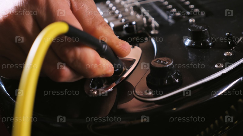 Крупный план руки, подключающей желтый кабель к электрогитаре, с фокусом на входном разъеме и ручках управления