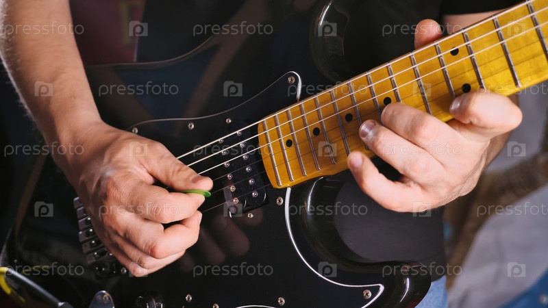 Крупный план человека, играющего на электрогитаре, фокусирующегося на своих руках и струнах. Человек использует зеленый медиатор, чтобы перебирать струны