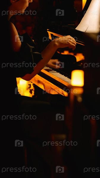 Крупный план женщины, играющей на пианино в тускло освещенной комнате. Фон размыт и имеет оранжевый цвет от горящих свечей