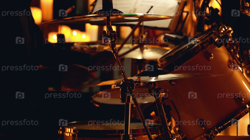Крупный план барабанной установки, играющей на тускло освещенной сцене. Фон размыт и оранжев. Рок или джаз концерт