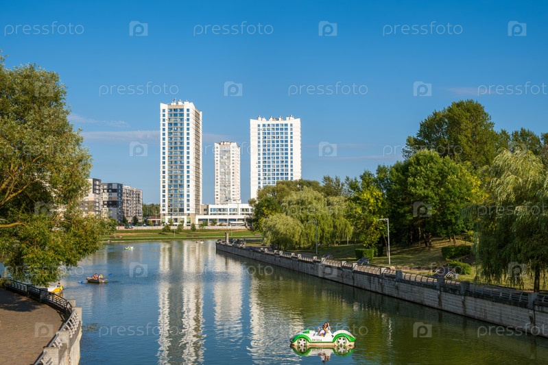 Минск, Беларусь - 16.08.24. Современный жилой комплекс с видом на реку, окруженный зеленым парком