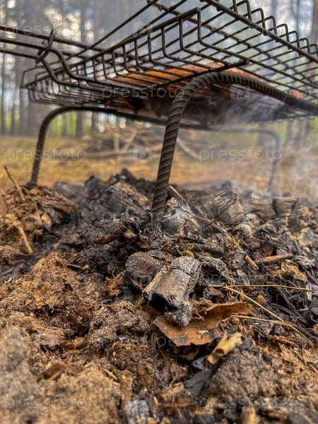 Мясо жарится на гриле в лесу на природе