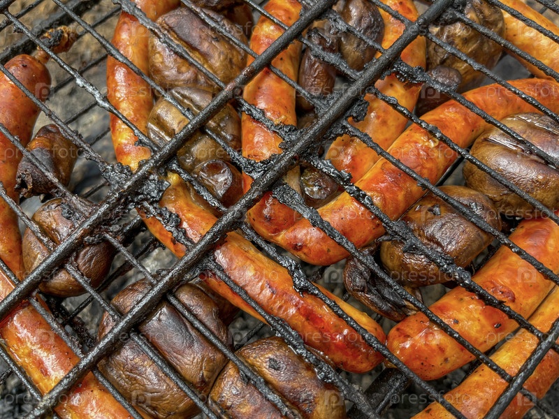 Мясо жарится на гриле в лесу на природе