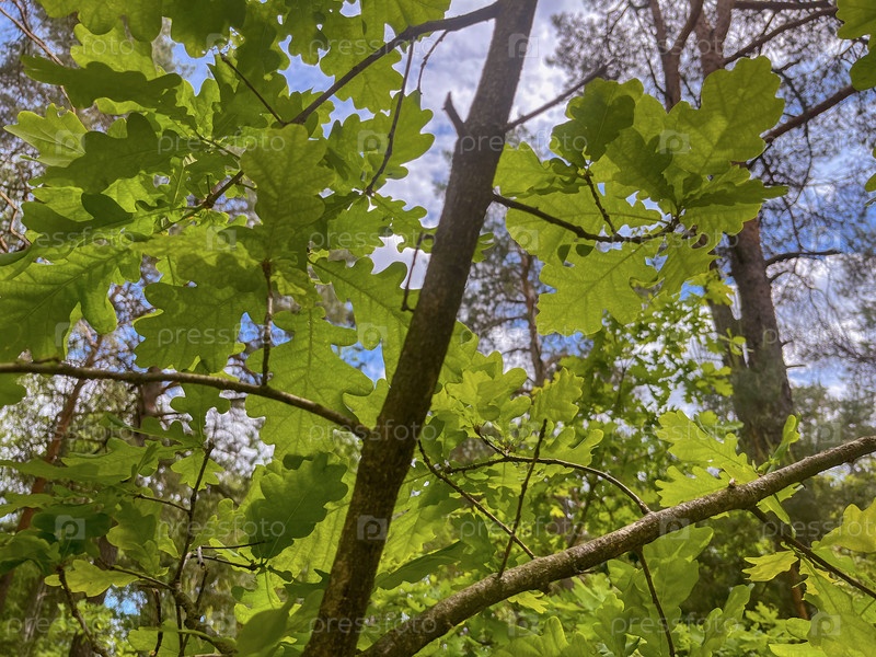 Молодой дуб с молодыми сочными листьями растет на фоне неба