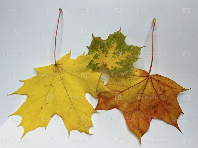 Разноцветные осенние кленовые листья на белом фоне