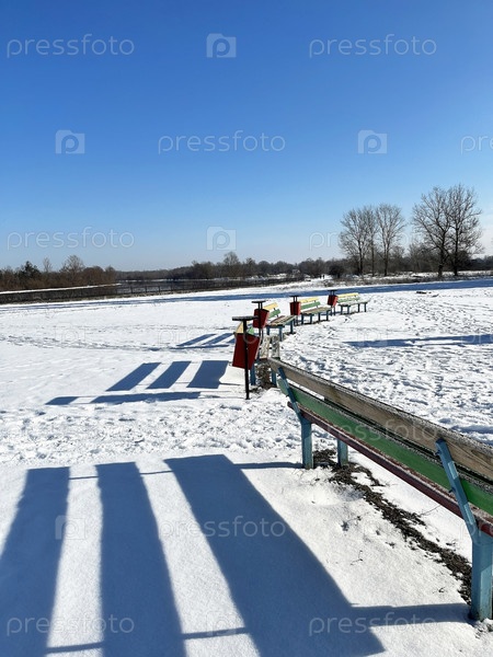 Набережная зимой и разноцветные скамейки