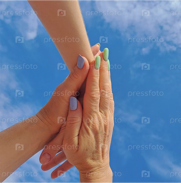 Женские руки на фоне летнего голубого неба с облаками