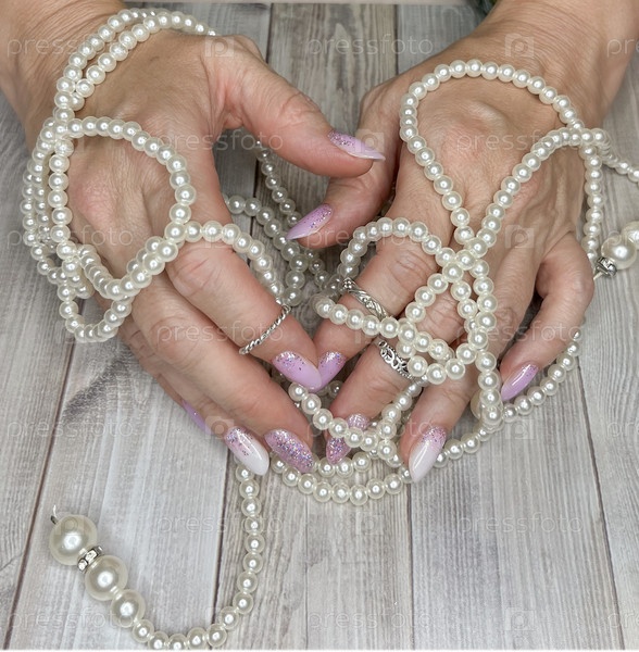 Женские руки с накрашенными ногтями на фоне украшений из серег, бус и браслетов