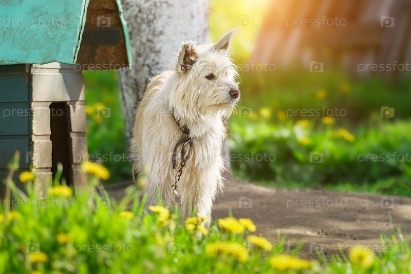 Дворняга рыжего окраса на цепи Весна