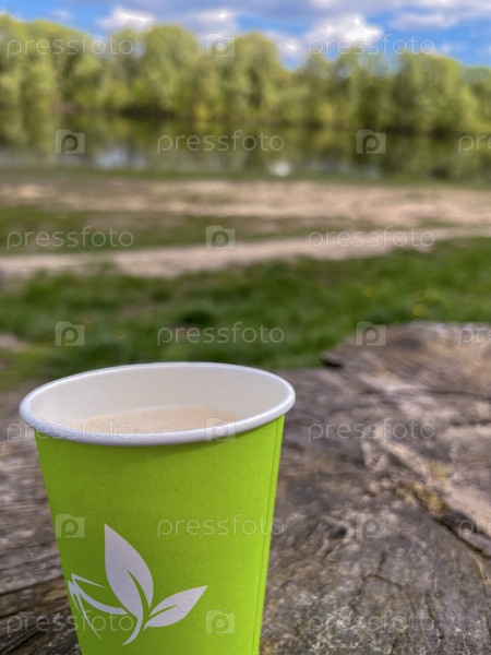 Бумажный стаканчик на фоне красивого берега реки Березина летом