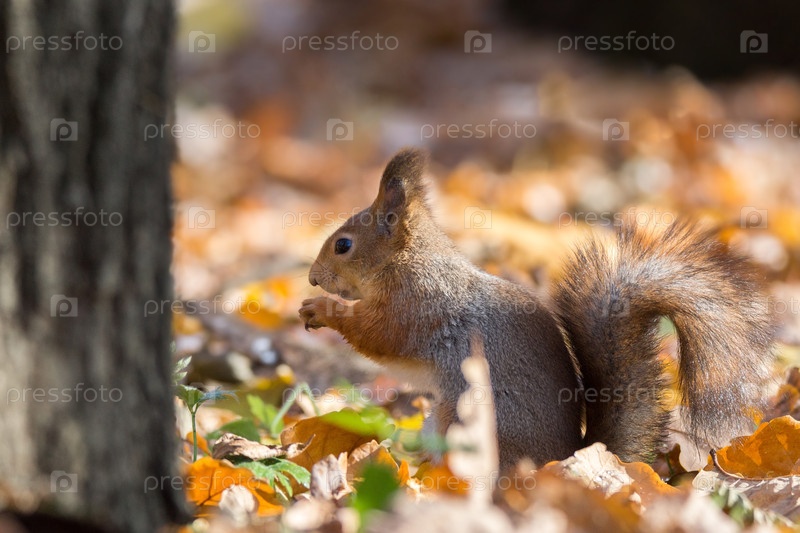 Рыжая белка на ветке осенью