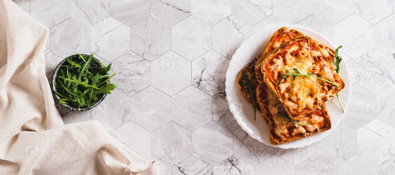 Хрустящая пицца с беконом, сыром и кетчупом на тосте на тарелке вид сверху веб-баннер