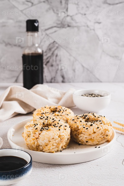 Острые пончики с рисом и говядиной на тарелке на столе вертикальный вид