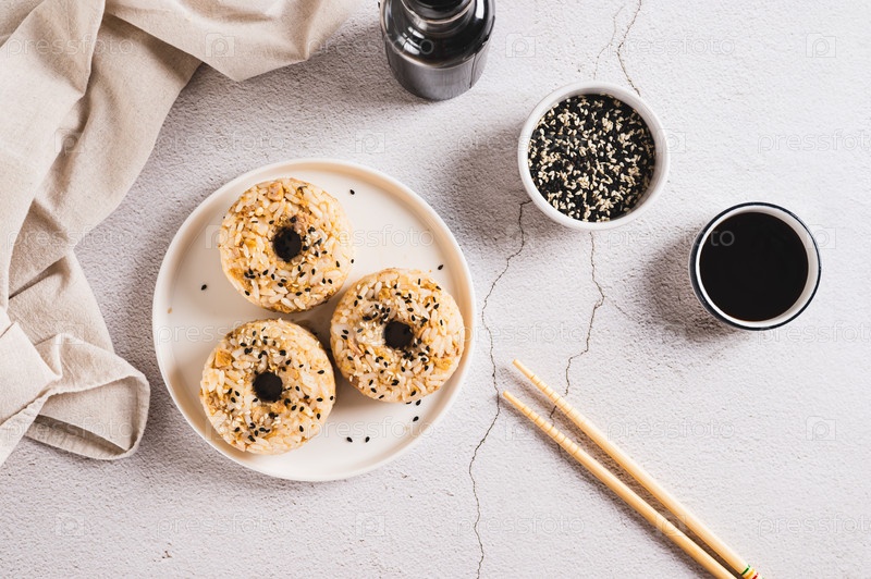 Острые пончики с рисом и говядиной на тарелке на столешнице