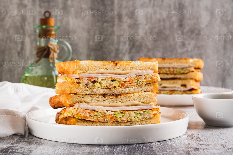 Тост «Гилгеори» с капустой, морковью, ветчиной и сыром на тарелке на столе