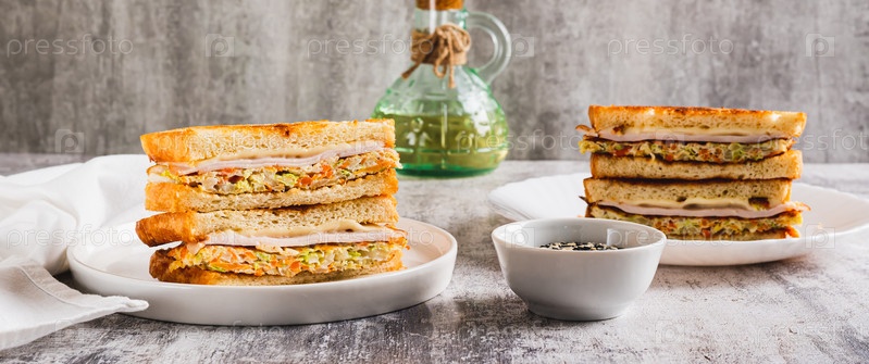 Тост Гилджори с капустой, морковью, ветчиной и сыром на тарелке на столе веб-баннер