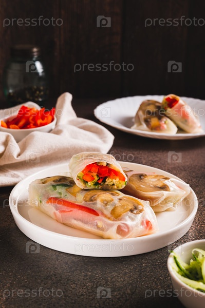 Вегетарианские спринг-роллы с огурцом, перцем и жареными грибами на тарелке вертикальный вид
