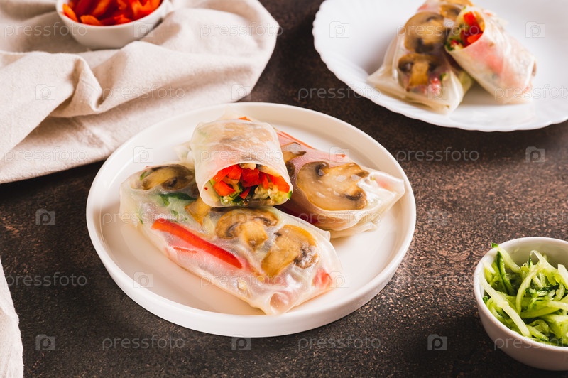 Вкусные спринг-роллы с овощами и грибами в рисовой бумаге на тарелке на столе