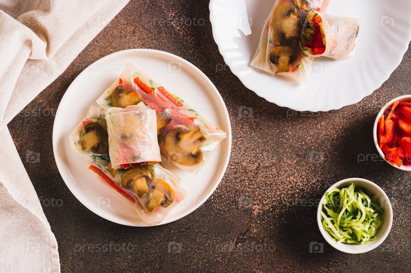Вегетарианские спринг-роллы с огурцом, перцем и жареными грибами на тарелке, вид сверху