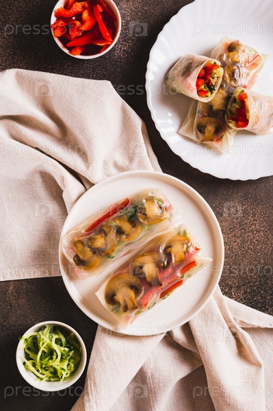 Вкусные спринг-роллы с овощами и грибами в рисовой бумаге на тарелке сверху и вертикальный вид