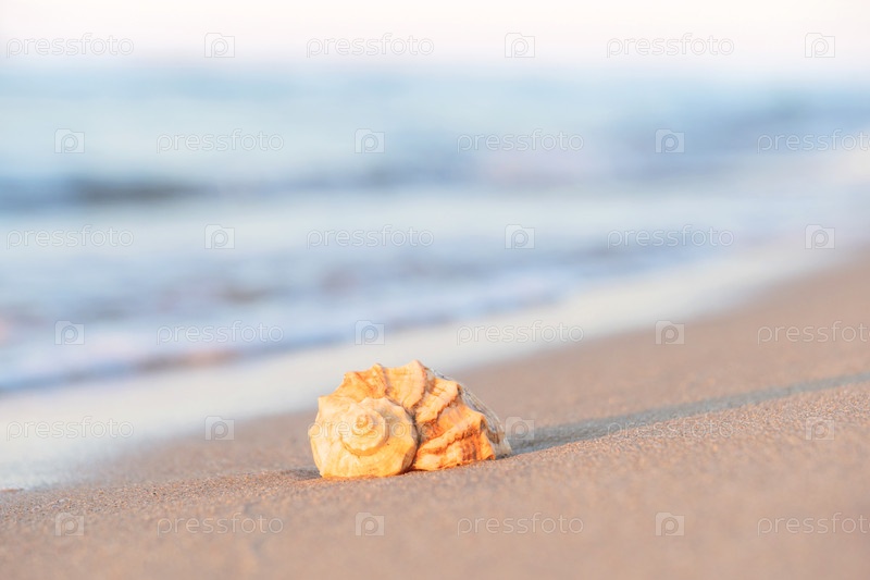 Красивая ракушка лежит на пляже, рядом с лазурной водой моря