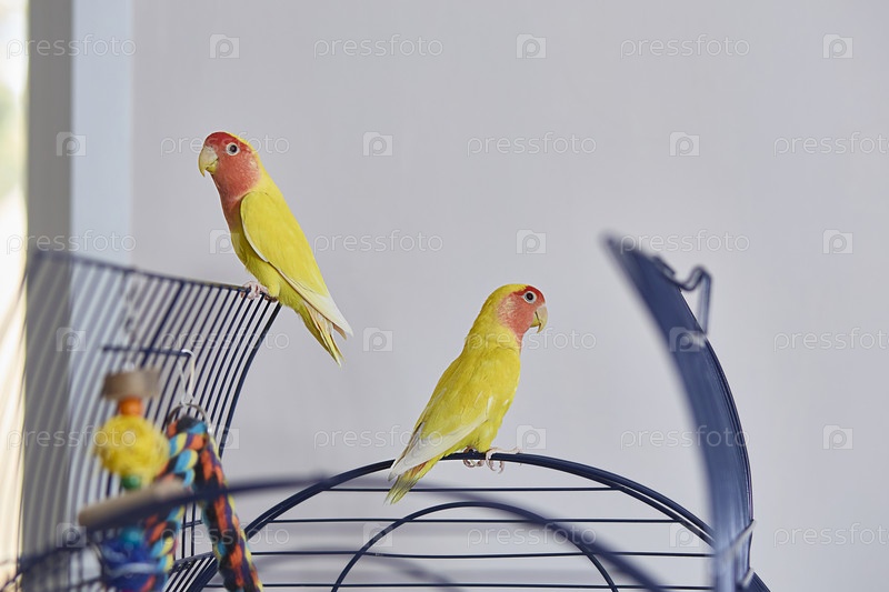 Пара Agapornis roseicollis, также известный как желтый неразделитель, лютиновый неразделитель и розовосточный неразделитель, в клетке