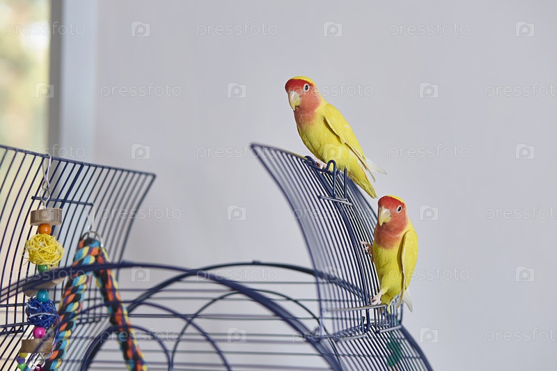 Желтые розовощекие неразлучники гуляют по своей открытой клетке