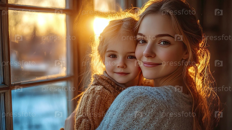 Красивая поздравительная открытка ко Дню матери. Трогательный момент, когда мать обнимает своего ребенка, мягкий золотистый свет заката, уютная домашняя атмосфера