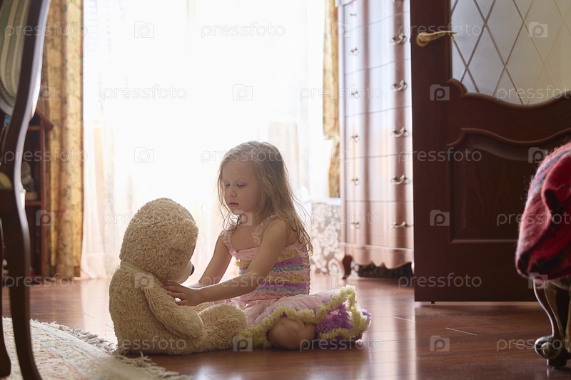 Ребенок играет с плюшевым мишкой в тепло освещенной гостиной в дневное время