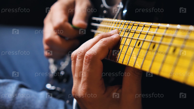 Крупный план руки гитариста на ярко-желтом грифе электрогитары. Пальцы прижимают струны к ладу. Мужчина играет ритм в рок- или метал-музыке