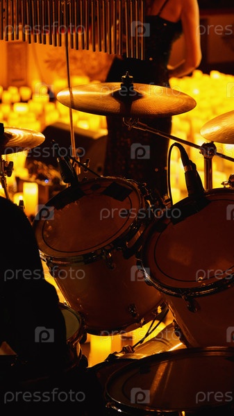 Барабанная установка, освещенная теплым янтарным светом сцены, со стойками для тарелок, установленными томами и барабанами. Расположена на фоне свечей