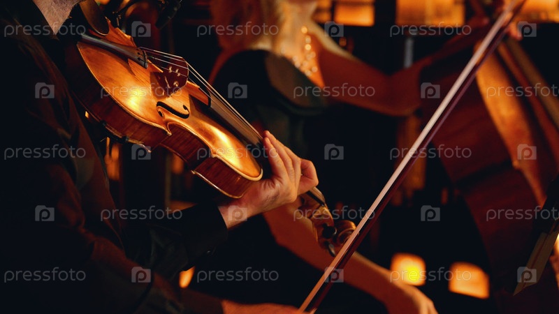 Крупный план скрипки в руках скрипача, выступающего на сцене в составе оркестра. Тусклое оранжевое освещение